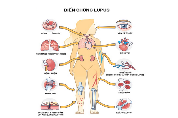 Ngoài các triệu chứng phổ biến trên, lupus ban đỏ hệ thống là bệnh có nguy cơ biến chứng cao, phổ biến là: